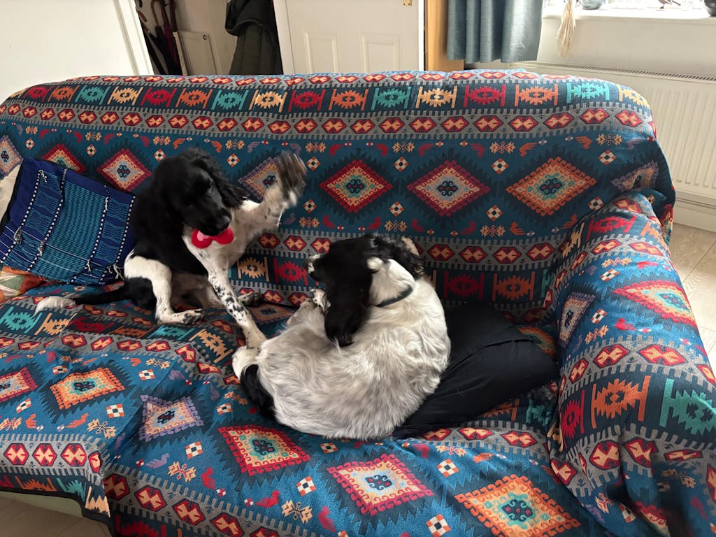The jacquard sofa throw looks great, is tough enough for the dogs and doesn’t show the dirt. My only problem is having to constantly straighten it. My dogs are very lively! I’m not sure if the non slip under at would help. The free gift heart toy lasted longer than most and was a lot of fun while it lasted.