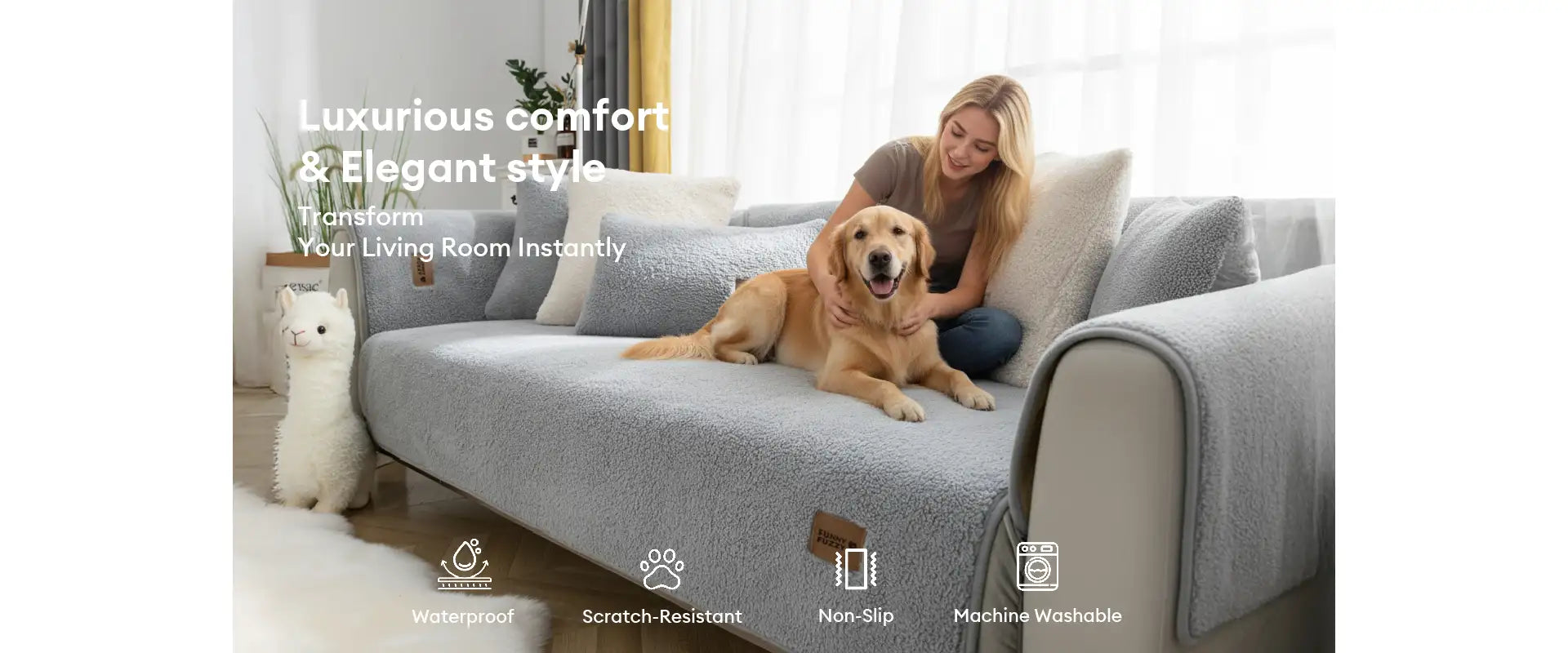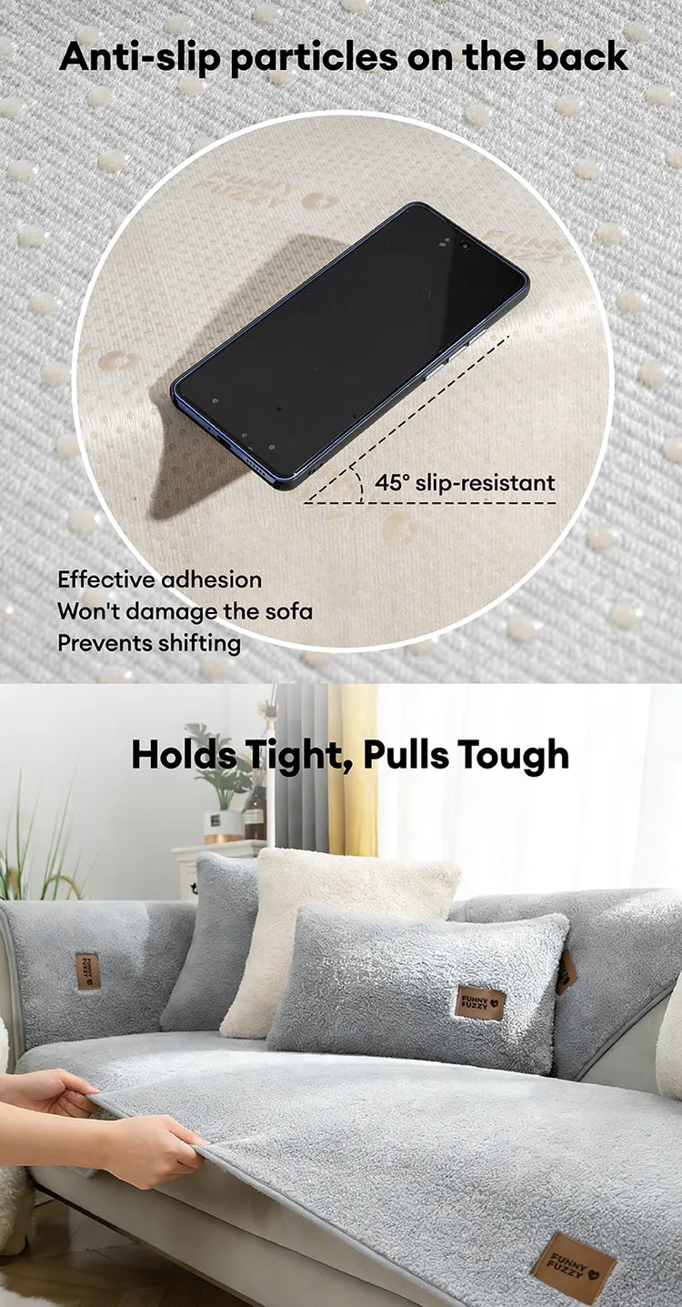 The FunnyFuzzy faux lambswool couch cover is specially designed for comfort. The thick faux lambswool material with its own thermal properties provides you and your pets with the warmest sense of security in cold temperatures.